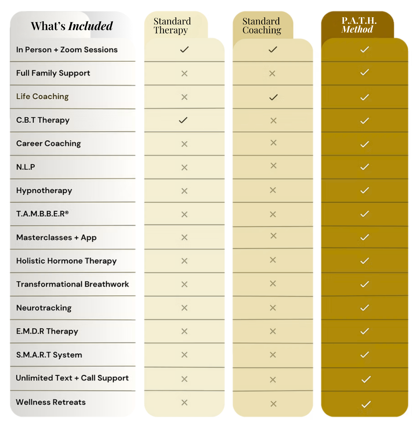 Mental Performance Coaching, Life Coaching, Adaptive Psychology, Motivational Interviewing, Music Therapy, Hypnotherapy, NLP, 360 Family Support, and Transformational Breathwork with our proprietary T.A.M.M.B.E.R Method®.